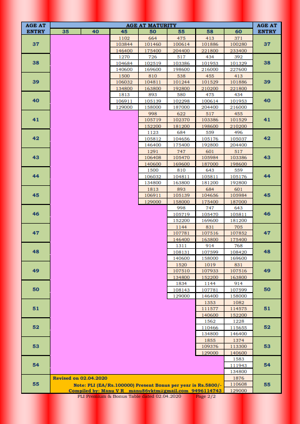 Pli Premium And Bonus Table Ea Policy Of Sum Assured Rs 100000 Po Tools