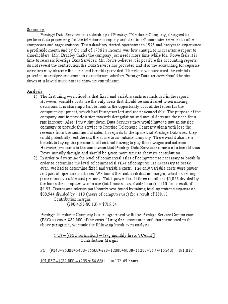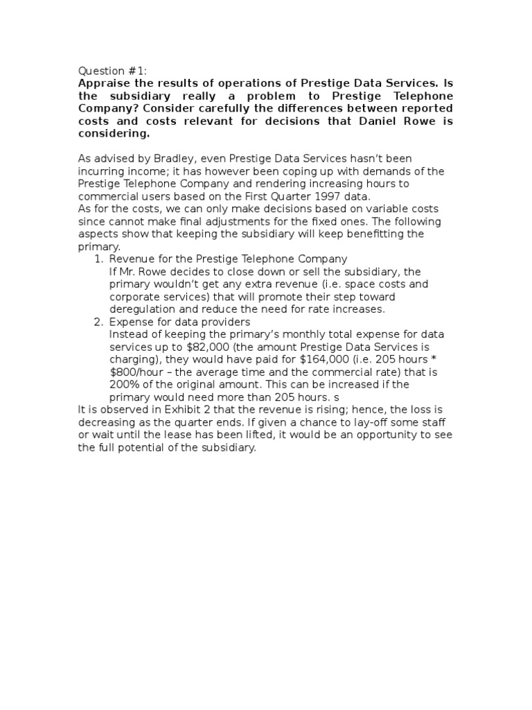Prestige Telephone Company Online Case Analysis Prestige Data