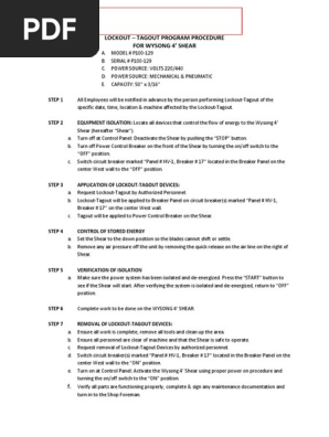 Lockout Tagout Specific Wysong 4ft Shear Electric Power